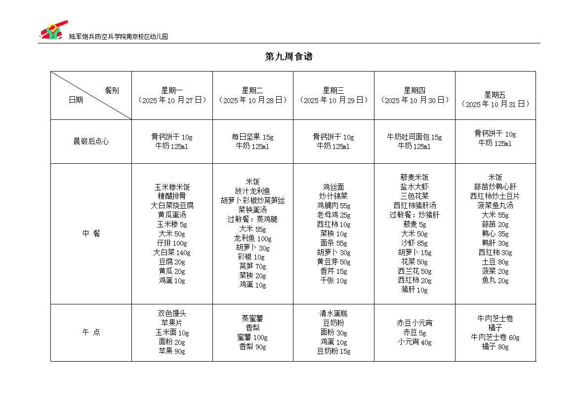 2025-2026学年度第一学期第九周食谱